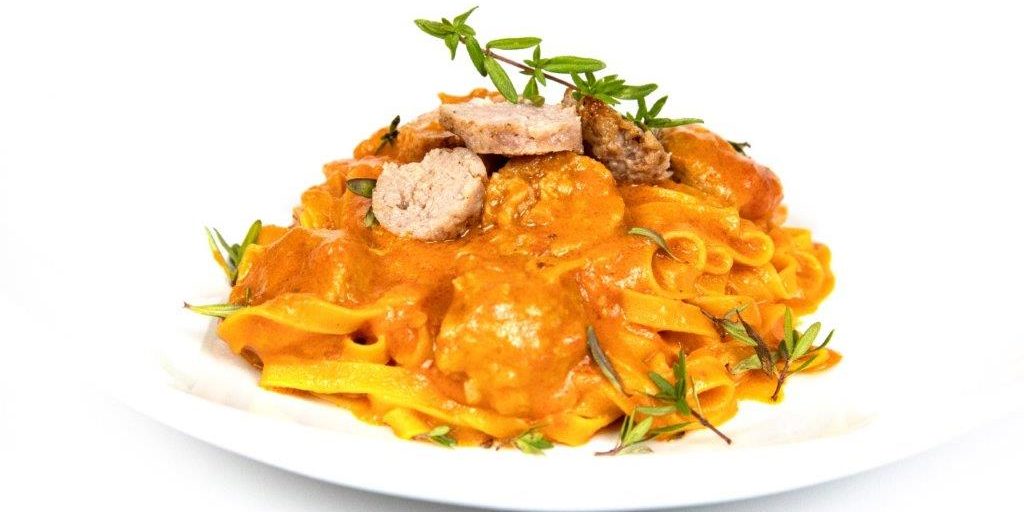 In a pan with a drizzle of “Il Frantoio” EVO oil, cook the sliced sausages blending them with white wine, in a pan with a drizzle of “Il Frantoio” EVO oil, brown the garlic, add the chili and peeled tomatoes “SARNO” cook for about 20 minutes, remove the garlic cloves, and add the sauce with pecorino cream and sausages in a pan.