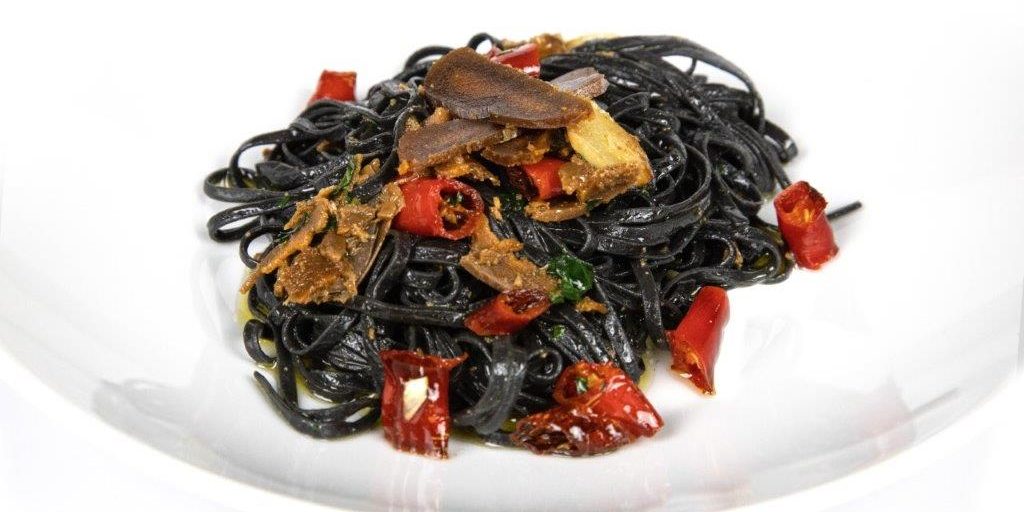 Cook the LUINGUINE AL NERO DI SEPIA “Casa Rovigatti” in abundant salted water for 2-3 minutes, drain the pasta and stir in a pan and serve, adding the remaining bottarga cut into slices on top.