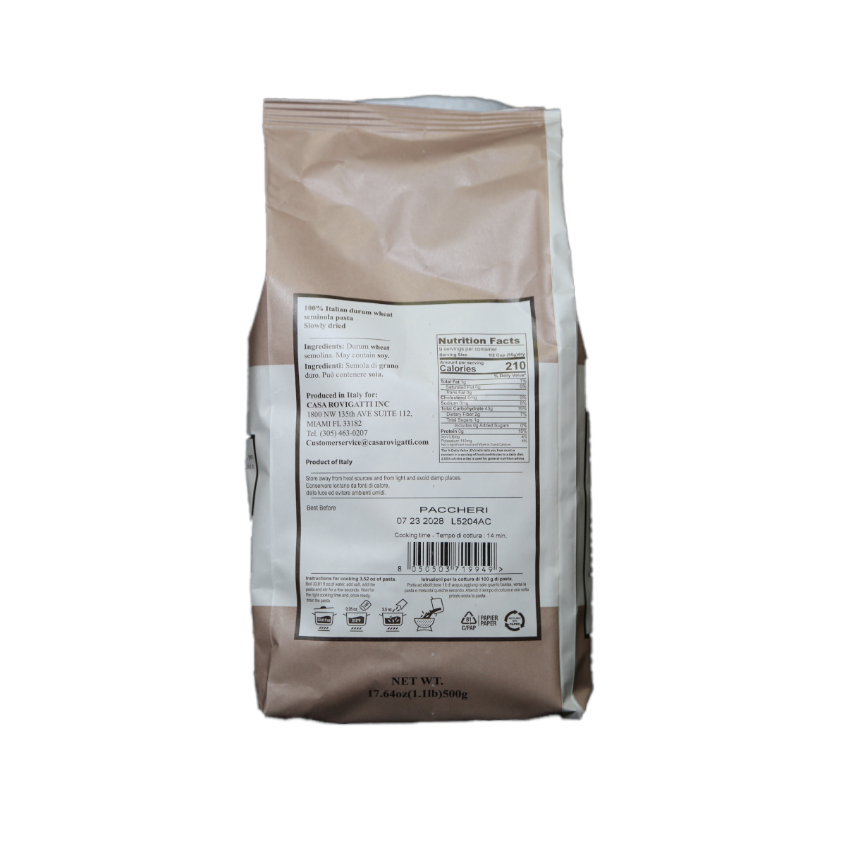 Casa Rovigatti Paccheri is produced with selected 100% Italian grains, bronze drawn at low temperature to keep intact all the nutritional values and healthy proteins of durum wheat. They go well with fresh and light sauces.