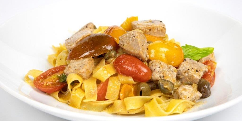 In a pan with a drizzle of “Il Frantoio” EVO oil, fry the garlic cloves and cherry tomatoes, adding salt and pepper for 10 minutes, if necessary, add a little cooking water, chop the tuna into large cubes, add it to the sauce of cherry tomatoes with olives and capers and cook for another 5 minutes.