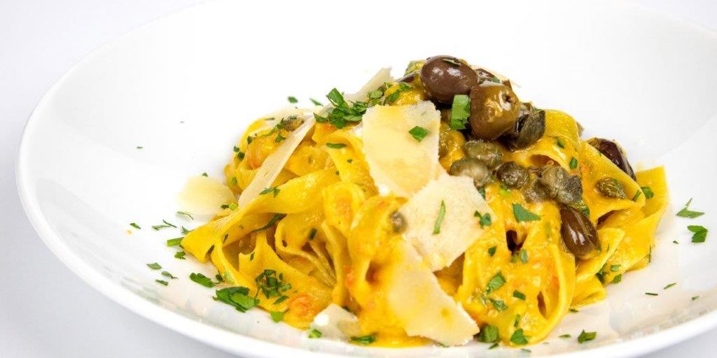 Cook the TAGLIATELLE DI CAMPOFILONE “Casa Rovigatti” in abundant salted water for 3 minutes, drain the pasta in a pan with the pepper cream, add the capers, olives, and parsley, stir for 5 minutes. Serve with the flakes of Parmesan cheese.